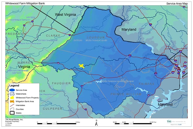 The Whitewood Farm Mitigation Bank is located in Fauquier County near The Plains, Va. This large Bank is part of a 1,620-acre working farm that has been in agriculture more than 100 years.