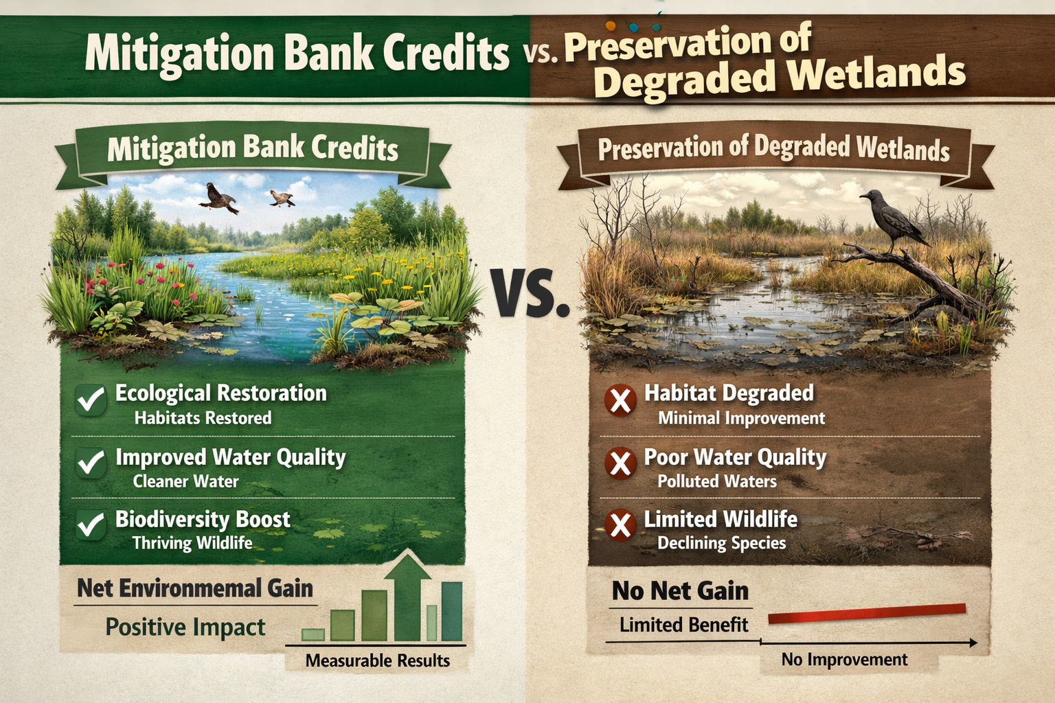 Equally important, mitigation banking consolidates many small impacts into larger, professionally managed restoration sites. This creates stronger hydrology, larger contiguous habitat blocks, and resilient systems capable of supporting species over time—outcomes impossible to achieve on scattered project-by-project preservation sites.