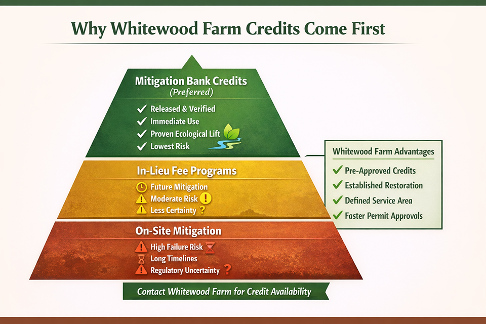 At Whitewood Farm Mitigation Bank, the answer is clear—bank credits come first. Not just because of regulatory preference, but because they deliver certainty, speed, and superior ecological outcomes.